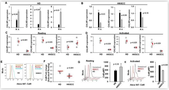 在此次研究中,研究人员从19例年龄在47~84岁、组织活检确诊为头颈部肿瘤的患者体内抽取外周血,并对这些患者的外周血血液样本进行了检测。结果发现:和正常的人群相比,这些患者的CD8+ T细胞中的钙调素的含量低于健康人,而钙调素主要和KCa3.1通道的活性密切相关相关。