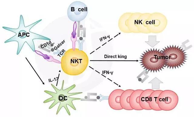 通常情况下,NKT细胞活化后参与抵抗各种微生物的感染,并通过分泌细胞因子等活化其它免疫细胞在抗肿瘤过程中发挥调节作用。