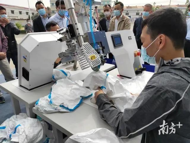 江门市盈丰智能装备有限公司现场演示防护服压条机。南方日报记者 李凤祥 摄