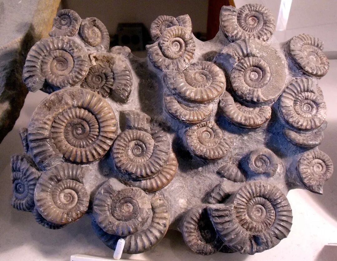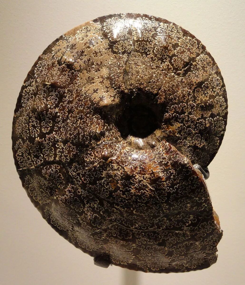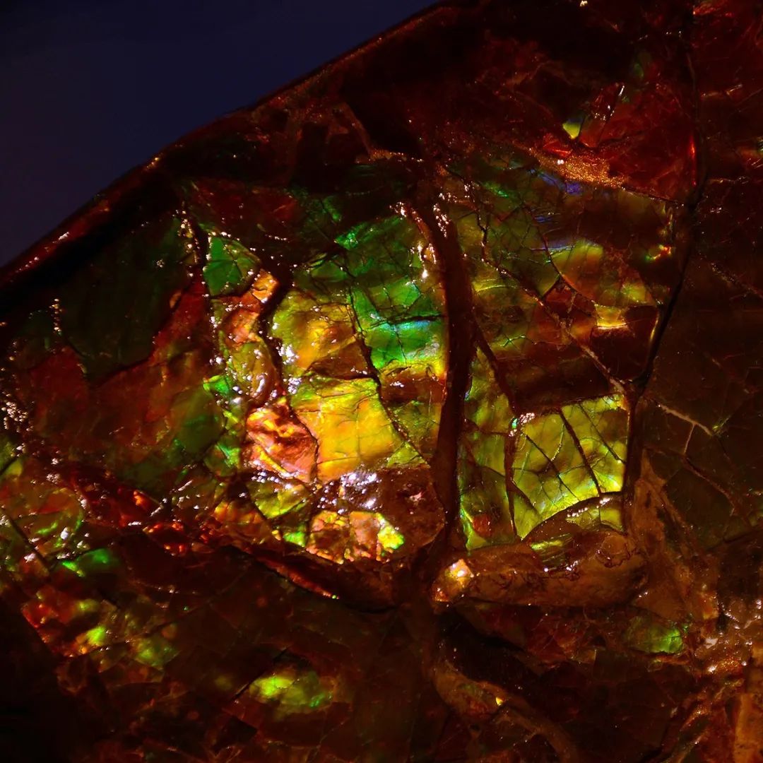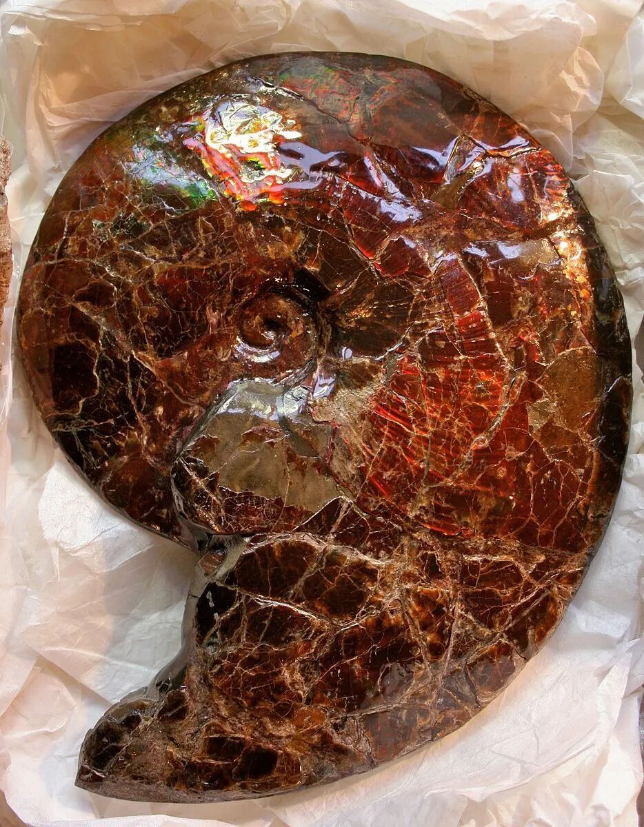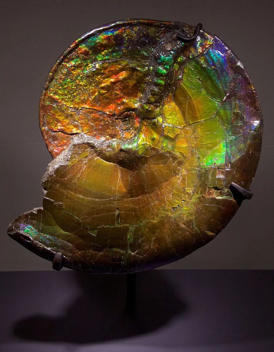 出自加拿大阿尔伯塔省的斑彩石。图片:James St. John / Wikimedia 千万年前的遗存 如果你见过完整开采出来的斑彩石,你很快会意识到它是化石遗存——这些直径可以达到90厘米的大“圆盘”有着清晰的螺旋结构,一看就是来自古代的软体动物。 如果你把整块斑彩石翻过来,你会发现它是两侧对称的,没有向哪一侧突起,这说明它不是腹足类的海螺,而是像鹦鹉螺一样的头足类。 菊石化石上隐约可见的彩虹光泽。图片:Mike Peel / Wikimedia 这样,你看到它的英文名字的时候,也就不会意外了:斑彩石Ammolite和菊石Ammonite只有一个字母之差,稍微不细心一点的人估计一眼都看不出区别来。实际上,古生物学家早就给这些化石菊石定了名,它们来自糕菊石属(Placenticeras)下的两个物种:米克糕菊石(P. meeki)和交替糕菊石(P. intercalare)。 说到化石,我忍不住又要把欧珀拿出来说说。实际上,欧珀也经常会形成化石。如果条件合适的话,欧珀会填充古生物埋藏时留下的空隙,取代原有的生物而形成化石。但欧珀只是一个“哪里需要哪里搬”的角色——箭石、菊石、海螺、螃蟹,哪怕是脊椎动物的骨架,都有欧珀版本的。 菊石出现于泥盆纪早期,和恐龙一起灭绝于白垩纪末,跨越古生代和中生代,在海洋中生活了3.43亿年,是非常成功的一个类群——要知道,地球上出现最早的动物至今也不过只有6.65亿年的历史。 当然菊石在史前大海里的生活也不是一帆风顺,因为有无数后起的动物们与他们激烈地竞争着海底霸主的地位。菊石的演化速度非常快,用流行的互联网词汇来说,是一个“不断试错、不断更新迭代的产品”。 《自然界的艺术形态》(Kunstformen der Natur )一书中,呈现的各种菊石。图片:Wikimedia 菊石分布十分广泛,能够很容易地留下外壳的化石,而且随着地质年代不同,留下的菊石化石特征各不相同。在地质学家眼里,它们是一种非常有用的“标准化石”——他们可以轻易地通过在某个底层里发现的特定菊石,来确定这个地层的年龄。 英格兰约克郡出土的侏罗纪早期菊石化石。图片:Mike Beauregard / Wikimedia 家族最后的荣光 斑彩石出现的白垩纪末期,已经是菊石最后的日子。虽然和恐龙一样,菊石们应该也是随着一次大爆炸而突然在地球上消失,但是它们的灭绝似乎在此之前已经可以见到端倪——白垩纪末期的菊石面临着鱼类和蛸类(章鱼、乌贼)的双重竞争,多样性已经受到了极大的打击。 晚期的菊石不再像之前那样,拥有各式各样的厚重、多棘的外壳,而是逐渐趋向于拥有扁平、光滑、相对较薄的外壳——就像是我们现在见到的斑彩石那样。 这样的外壳,可以让菊石们具有更高的游泳速度——糕菊石可能是整个3.43亿年历史中,菊石游泳竞速的冠军。 米克糕菊石化石。图片:Daderot / Wikimedia 当然,和擅长游泳的鱼类、蛸类相比,最快的菊石在速度上也毫无竞争优势。但是因为菊石具有储存空气以平衡浮力的外壳,这让糕菊石在垂直方向有着非常大的机动性,远超鱼类。遇到敌人的话,它们可以快速潜到极端缺氧的深海,避避风头。 然而多样性的缺失,也就意味着把所有的鸡蛋放在了一个篮子里。菊石熬过了第二、第三、第四次大灭绝,但是最终还是倒在了第五次大灭绝上。 而斑彩石,或许是菊石家族最后留下的,最绚丽的一枚纪念勋章。 交替糕菊石化石。图片:Mike Peel / Wikimedia 机缘巧合的造化 绝大部分宝石级的斑彩石原料出产自加拿大阿尔伯塔省、萨斯喀彻温省和美国蒙大拿州的同一个地层内,距今7500万到7300万年之间。 阿尔伯塔省南部的落基山东麓是出产最高质量的斑彩石的地方。白垩纪晚期的海平面比现在要高,当时的北美其实并非像现在这样是一块完整的大陆,而是被内陆海分隔成了三块,如今出产斑彩石的地方,正是这片内陆海的西岸。 在化石和宝石之间做跨界的并不太多,大抵是由于环境因素所限,化石里好看的角色并没有那么多见,但是凭借着流动的色彩,斑彩石成了跨界者中的翘楚。 拿起一块斑彩石,对着光线轻轻地晃动,石头里的绿色、红色、金黄色和蓝色像是活了一样,闪烁着各自的光彩。 流光溢彩的斑彩石。图片:Vassil / Wikimedia 斑彩石的颜色来自它独特的结构,和孔雀的羽毛、蝴蝶的翅膀、珍珠贝的珍珠母一样,是一种结构色。提供这种结构的,是斑彩石里的矿物质。 组成斑彩石最主要的成分是文石,其次是方解石,这两种矿物的化学成分都是碳酸钙,算是一对同分异构体——就像钻石和石墨那样。实际上,现生的软体动物的壳的主要组成成分也是它们俩。 这些文石的细微晶体呈平行排列,光线照到它们表面之后会逐层发生反射,这些反射光之间再发生干涉,就会呈现出斑彩石的七色变彩。 其实除了北美有分布之外,糕菊石属的成员在东非、南欧、中亚等地都有分布。有些其它产地的糕菊石上部分也有斑彩石类似的变彩,譬如说马达加斯加的糕菊石,但是其上具有变彩的部分面积小而不完整,很难用作宝石用途。 薄而脆弱的瑰丽 其实,让斑彩石真正展现出颜色的那层文石非常薄,一般只有0.5~0.8毫米厚,所以我们看到的斑彩石,背面实际上几乎都是附着在灰色或者棕黑色的底岩之上的。 如此薄的一层文石,在化石的沉积、变质过程中显然非常容易碎裂。这也是为什么经常能在斑彩石上看见被叫做“龙鳞状”的碎裂结构——虽然化石的完整性被破坏了,但其实也增加了一些