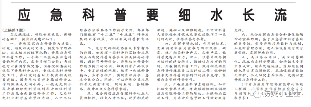 二、充分发挥相关协会及专家智库的作用,如发挥中国科普作家协会应急安全与减灾科普专委会及相关协会的作用,通过召开研讨会、开展相关科普创作能力提升的培训,解决科普产品低水平、重复建设的问题,培育一大批科普精品,多平台推广、实现资源共享,惠及全体公众。同时,可以开展公益应急科普大讲堂的活动,现场互动、答疑解惑,提升公众应急科学素质。