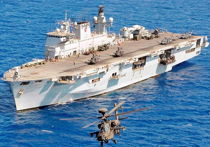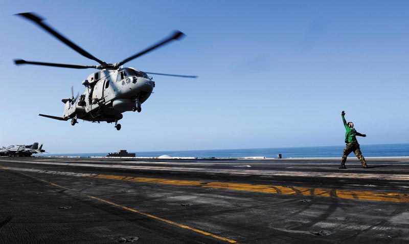 ▲ WAH-64“阿帕奇”直升机从“海洋”号上起飞