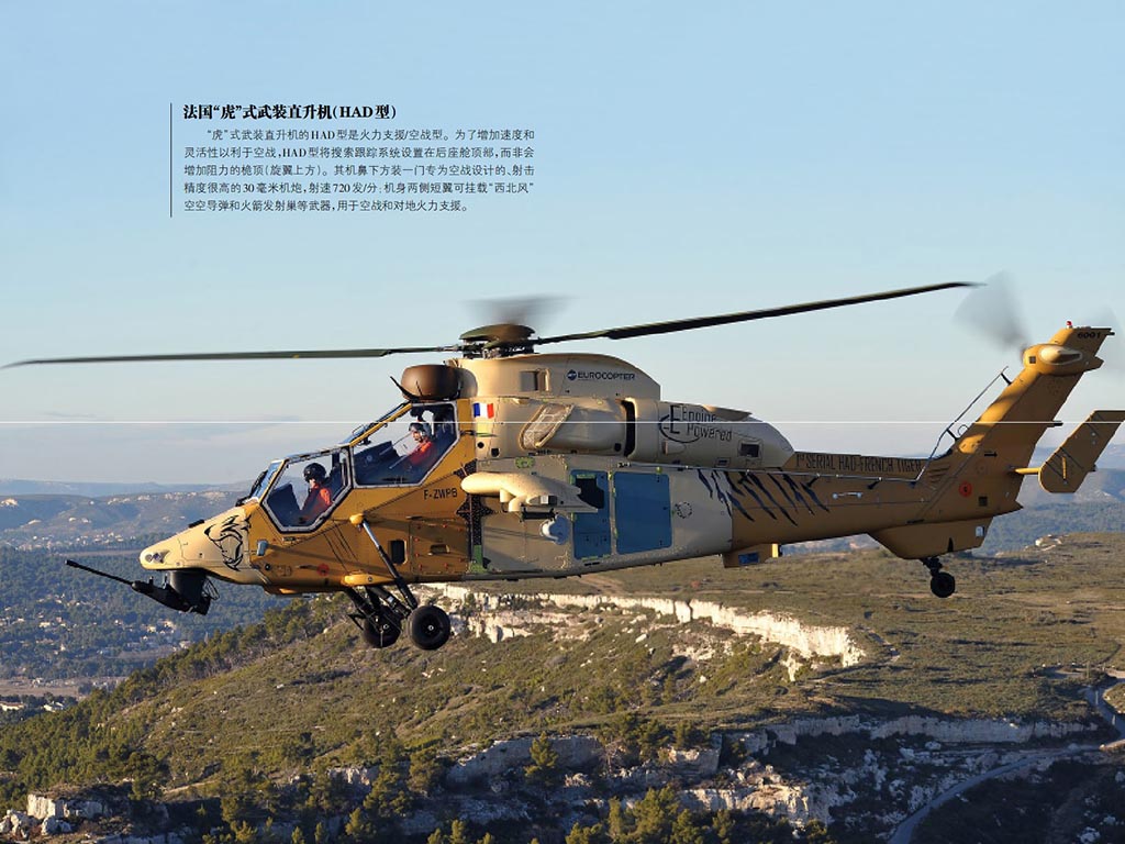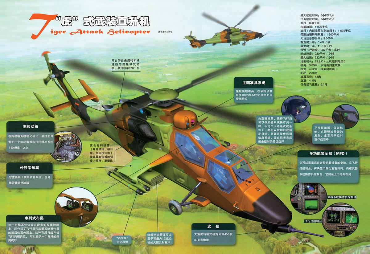 “虎”式武装直升机是欧洲最新型的专用武装直升机,由德国和法国联合研制。该机主要分为HAC/UHT反装甲型和HAP/HAD火力支援型。全机机体80%采用复合材料,坠毁防护性能较好,电磁信号特征低。