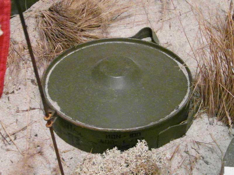 苏制MOH-100型防步兵地雷,属破片定向雷,是一种操纵地雷。全重5千克,装药量2千克,高82.5毫米,直径236毫米。引爆后装在雷壳内由钢筋切成的破片密集杀伤距离可达100米,杀伤宽度6.5~9.5米,破片向后方和两侧飞散的距离约30米。