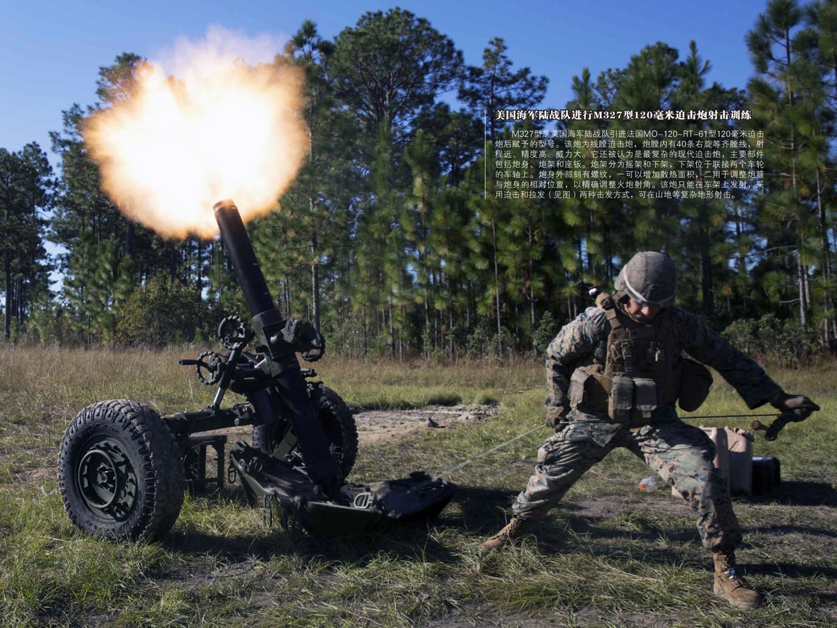 ▲ 美海军陆战队进行M327迫击炮的射击训练,M327迫击炮为美国引进法国MO-120-RT型迫击炮