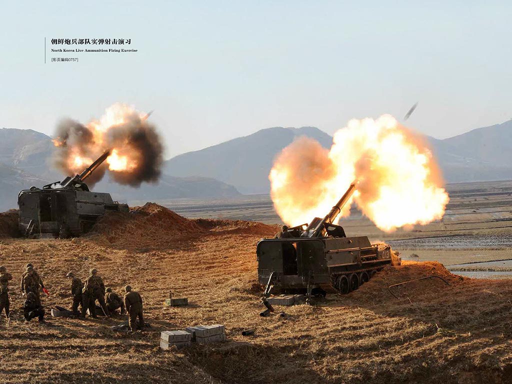 ▲ 朝鲜人民军的M1974型152毫米自行榴弹炮部队进行实弹演习