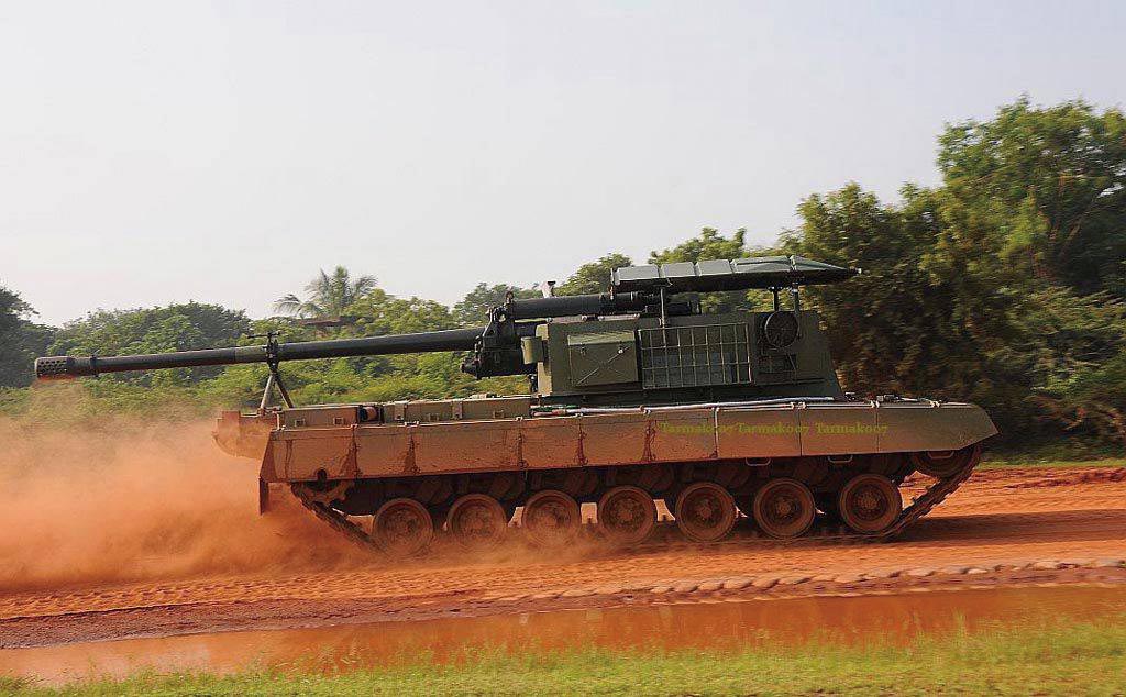 ▲ 印度“石弩”自行火炮,口径为130毫米。采用了固定战斗室和火炮朝后的设计。