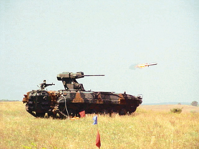 ▲ 罗马尼亚MLI-84步兵战车发射“欧洲长钉”反坦克导弹 。