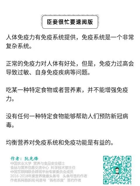 参考资料:《医学免疫学》.EUFIC.Food and coronavirus (COVID-19): what you need to know.Harvard Medical School.How to boost your immune system.Harvard Medical School.Can supplements help boost your immune system?Harvard Medical School.What can you do to improve your immune system?Harvard Medical School.Six ways you can help your immune system.商周.如何提高免疫力.商周.攻“城”记:一堂生动的免疫课.余新华.讲真,如何提高免疫力?不降低才是王道.No, you probably can’t ‘boost’ your immune system to prevent coronavirus. Here’s why.