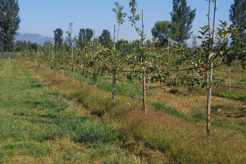 生草行的宽度取决于树冠大小、整形方式和机械作业的要求,一般为苹果树行间宽度的2/3。1~2年生幼树在树盘直径或树带宽度在1.0米以外的行间生草,3~4年生树保留2~2.5米树带或更宽。草种可单播或混播,单播管理比较方便,豆科草与禾本科草混播有利于提高刈草量。播种时间以春(3~4月)、秋(9月)两季土壤墒情较好时为宜。播种前整地,每亩施入1000kg有机肥和50kg磷肥,耕翻土壤。条播行距15~30cm,深度0.5~1.5cm。播后适当覆草,土壤板结时及时松土,利于出苗。出苗后及时清除杂草,结合灌水施入氮肥,促进生长。生草5~7年后,应深翻一次,打破多年生草根形成的板结层,休闲1~2年后再重新生草。