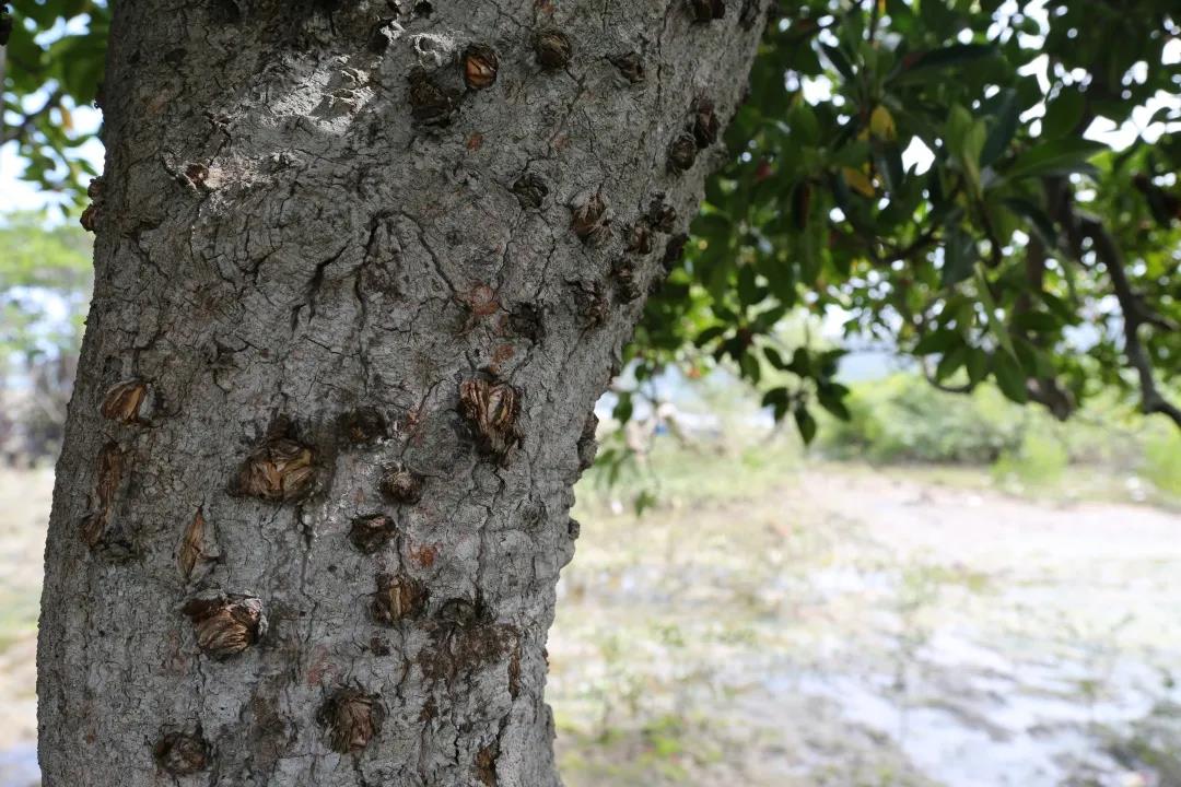 另一个法宝是通气组织,如果细心观察,不难发现水生植物都具有这样的结构,比如水稻的茎是中空的,莲藕也是中空的。红树植物的呼吸根系也一样,内部有发达的通气组织。有些呼吸根的表面还有密密麻麻的皮孔,这些皮孔如同红树植物的“鼻孔”,不仅出现在呼吸根上,尖瓣海莲等红树植物的树皮上也密布皮孔。