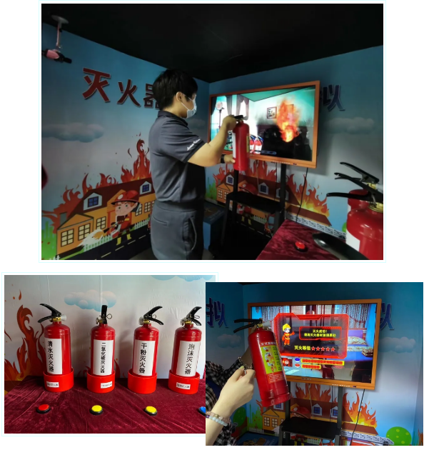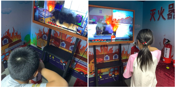 小朋友们跃跃欲试,通过屏幕显示的不同场景的火灾情况,选择并使用对应的灭火器进行灭火。小小消防员,灭火我能行。