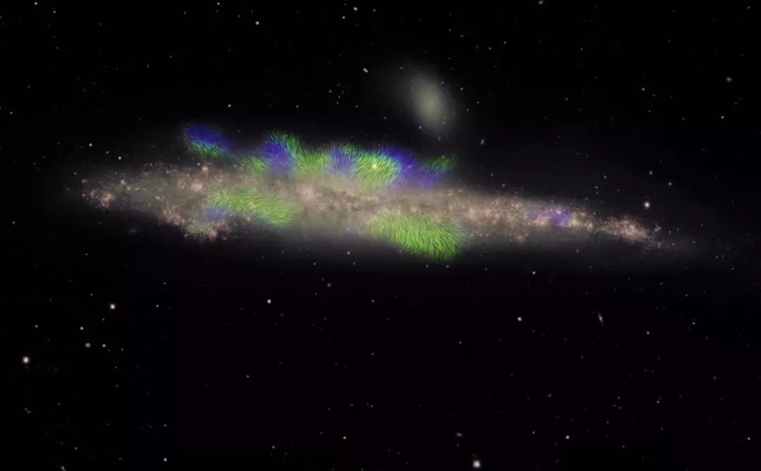 研究表明,这幅图像显示了一个大规模的相干磁场,该磁场由星系内的发电机作用产生;并以垂直于圆盘的巨大磁绳的形式向外旋转,这有点像盲人和大象,因为每次以不同的方式看待银河系,我们对它的本质得出不同结论!然而,似乎有一种罕见的情况,一种关于磁性发电机的经典理论,称为发电机,很好地预测了鲸鱼星系的观测结果,发电机模型在光晕中产生螺旋磁场,这些磁场是银河系圆盘中正常旋臂的延续。