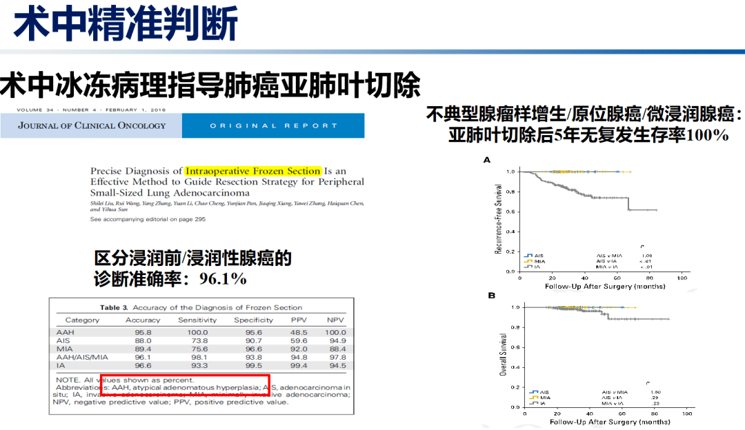 2011年陈海泉教授团队就开始通过术中冰冻病理指导进行亚肺叶切除。2016年陈海泉教授团队以“冰冻病理指导的亚肺叶切除”为题在《JCO》上发表了研究,这个方法使得手术的准确性达到96%,对国内外肺癌外科都是个非常重要的临床指导。
