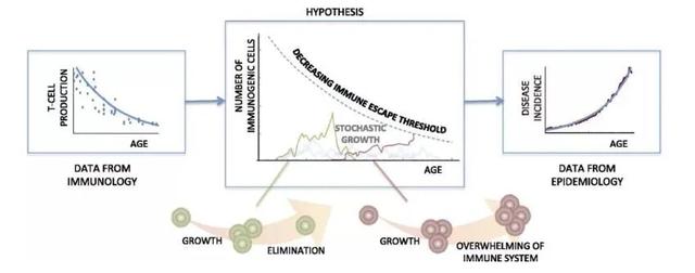 该研究由来自英国邓迪大学、赫瑞·瓦特大学、爱丁堡大学,以及法国巴黎第六大学的科学家们组成的团队开展,他们分析了200万例18~70岁癌症患者的数据,以此构建了一个数学方程式,用于评估癌症发病率上升与免疫系统衰退的关系,并将其与100种不同癌症的年龄分布进行比较。