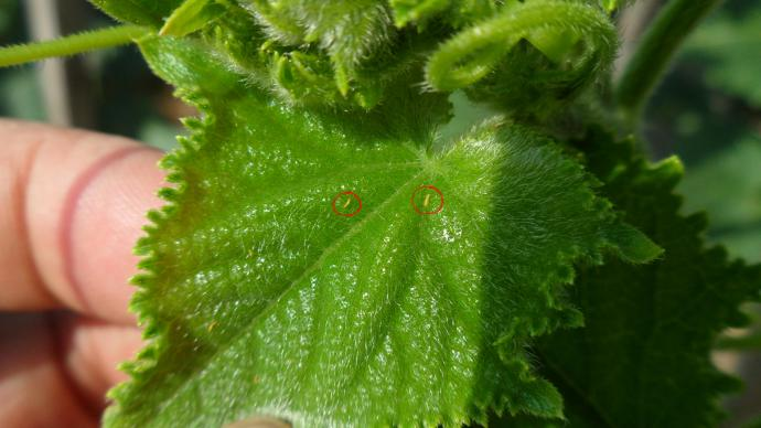 高级农艺师到黄瓜大棚里边看了一下,确实能看到蓟马,这种虫子一般是晚上出来,早晚叶片上会比较多,它的危害不像其他虫害和病害,有时候看叶片皱皱缩缩不平展,一般是以新叶为主,它的危害会很慢,叶面光合能力慢慢降低,植株的抗性也会降低。