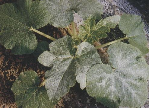 他的西葫芦长势不是很好,植株也不高,叶片有点下垂,叶子上边有点褶皱,茎部上端有点缩短,叶子上边有银白色的东西。