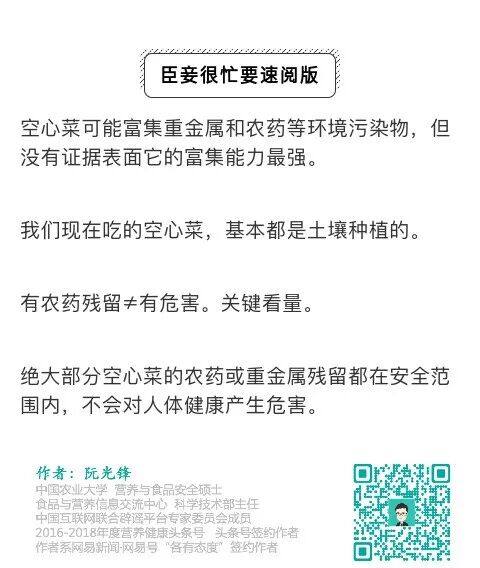 重金属是一种环境污染物,我们只能尽量避免。 从权衡风险和收益的角度,我们可以认为,只要是符合国家标准的,适当食用的风险是可以接受的。从目前来看,绝大多数的空心菜,重金属并未超标,还是可以放心食用。 农药残留虽然是人为带来的产物,但也都需要达到一定的量才会产生危害。 这个量有国家标准来进行规范的。目前来看,正规种植的空心菜中农药残留也在安全线以下,是不用太担心会给人体造成危害的。