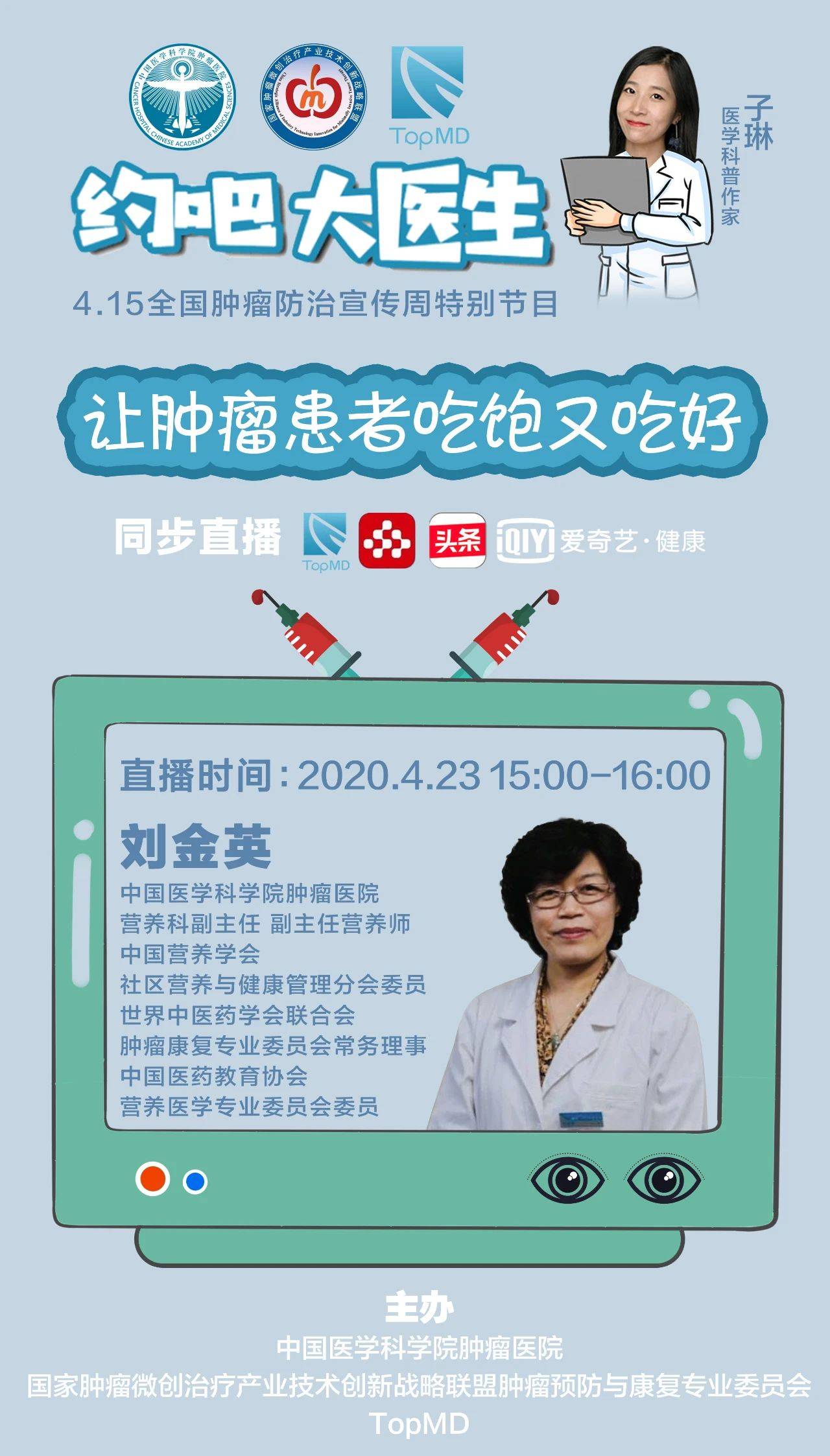 本期直播由中国医学科学院肿瘤医院、国家肿瘤微创治疗产业技术创新战略联盟肿瘤预防与康复专委会、TopMD联合主办,在TopMD、央视频、今日头条、爱奇艺等平台同步直播,我们现将直播的精华部分进行了整理,共3集,今天播出第(3)集,请转发给更多有需要的病友。