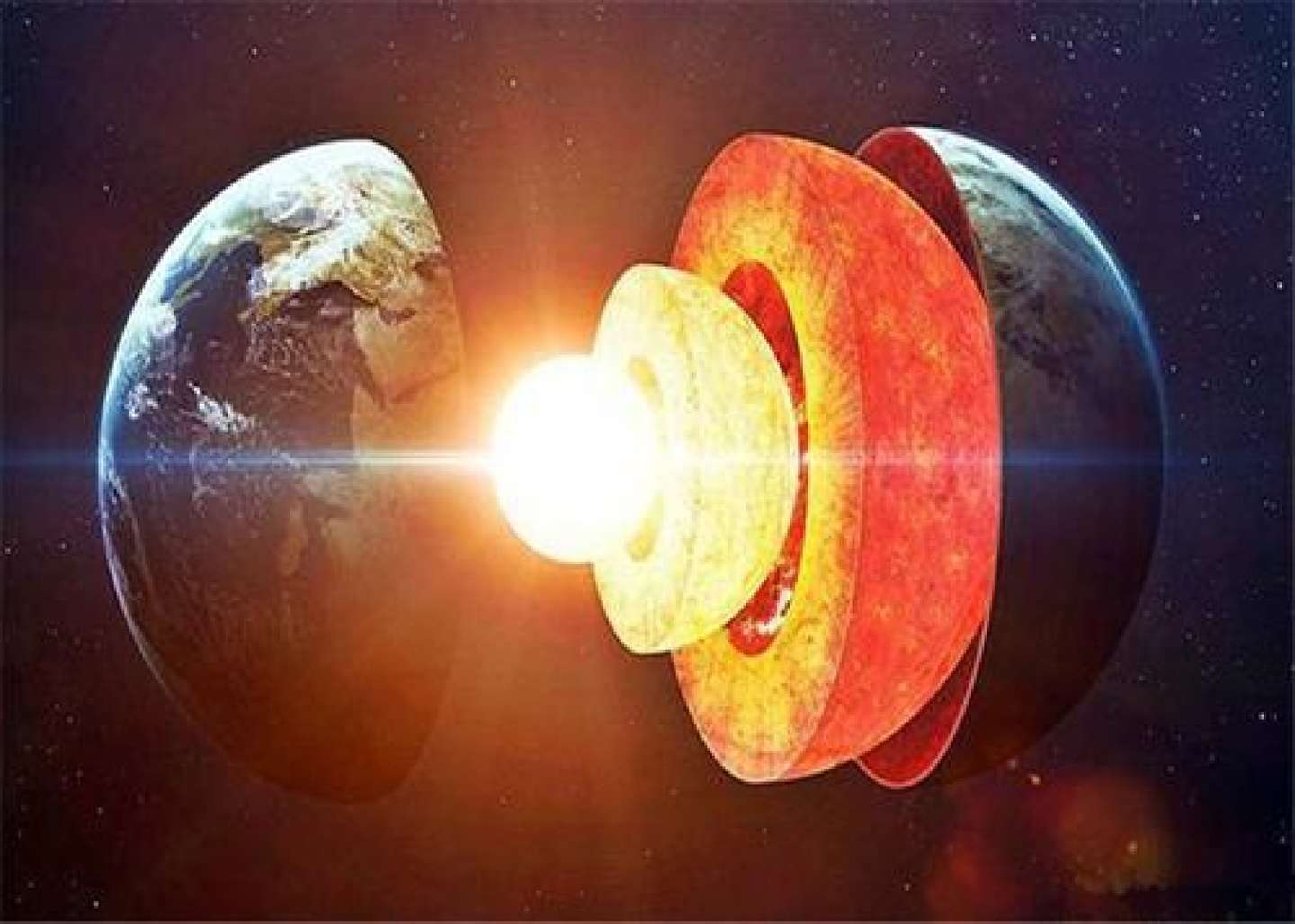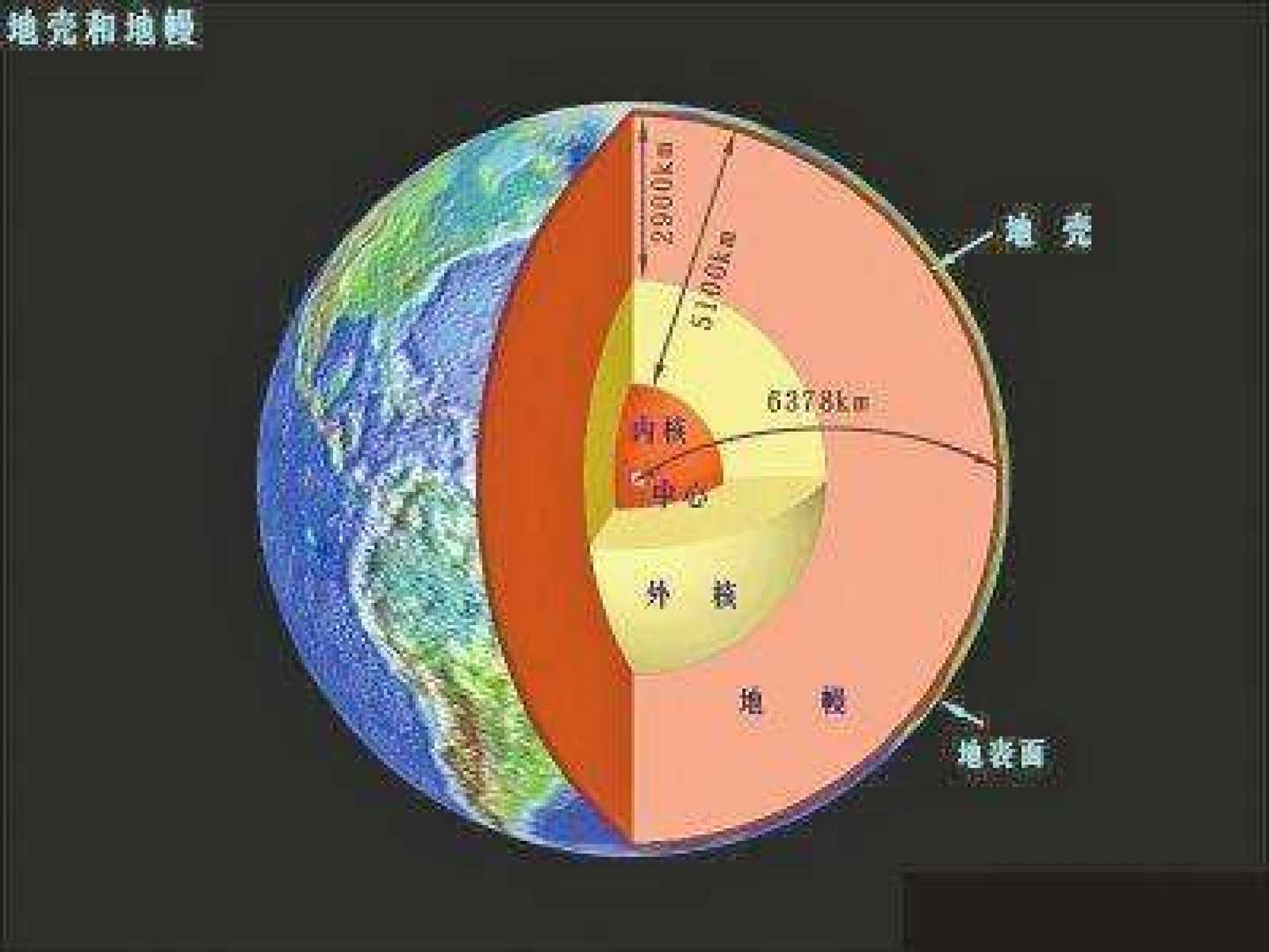 地核的平均厚度约3400km,分为外地核、过渡层和内地核三层。外地核厚度约2080km,物质为可流动液态;过渡层厚约140km,由液态渐渐转变为固态;内核半径约1250km,是一个由铁、镍等金属元素为主构成的固态圆球,这个圆球由于上面有一层液态圈与地幔分隔开,因此转动速度与外圈是不一样的,这样地核与地球外围就形成了一个发电机效应,被认为是地球磁场的来源。