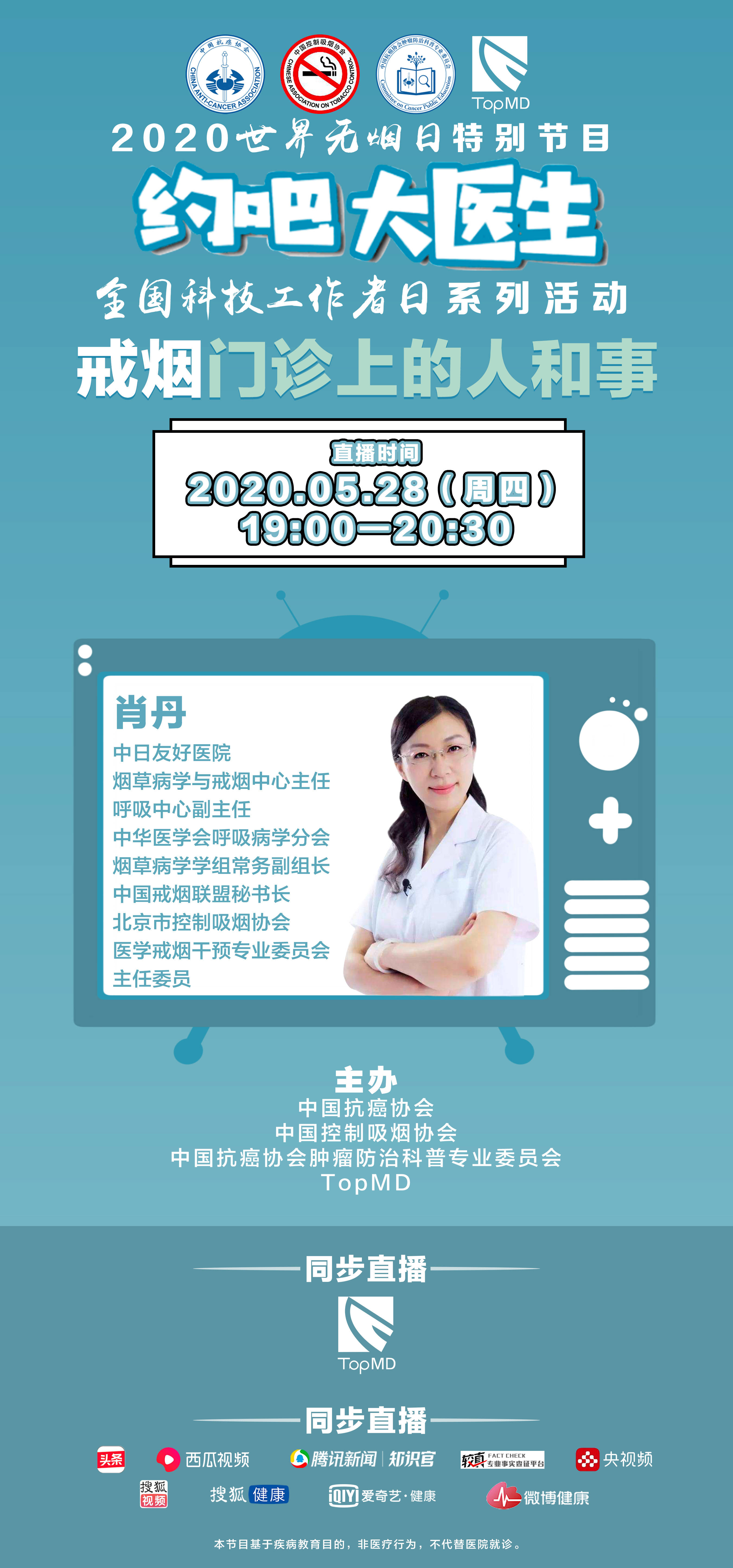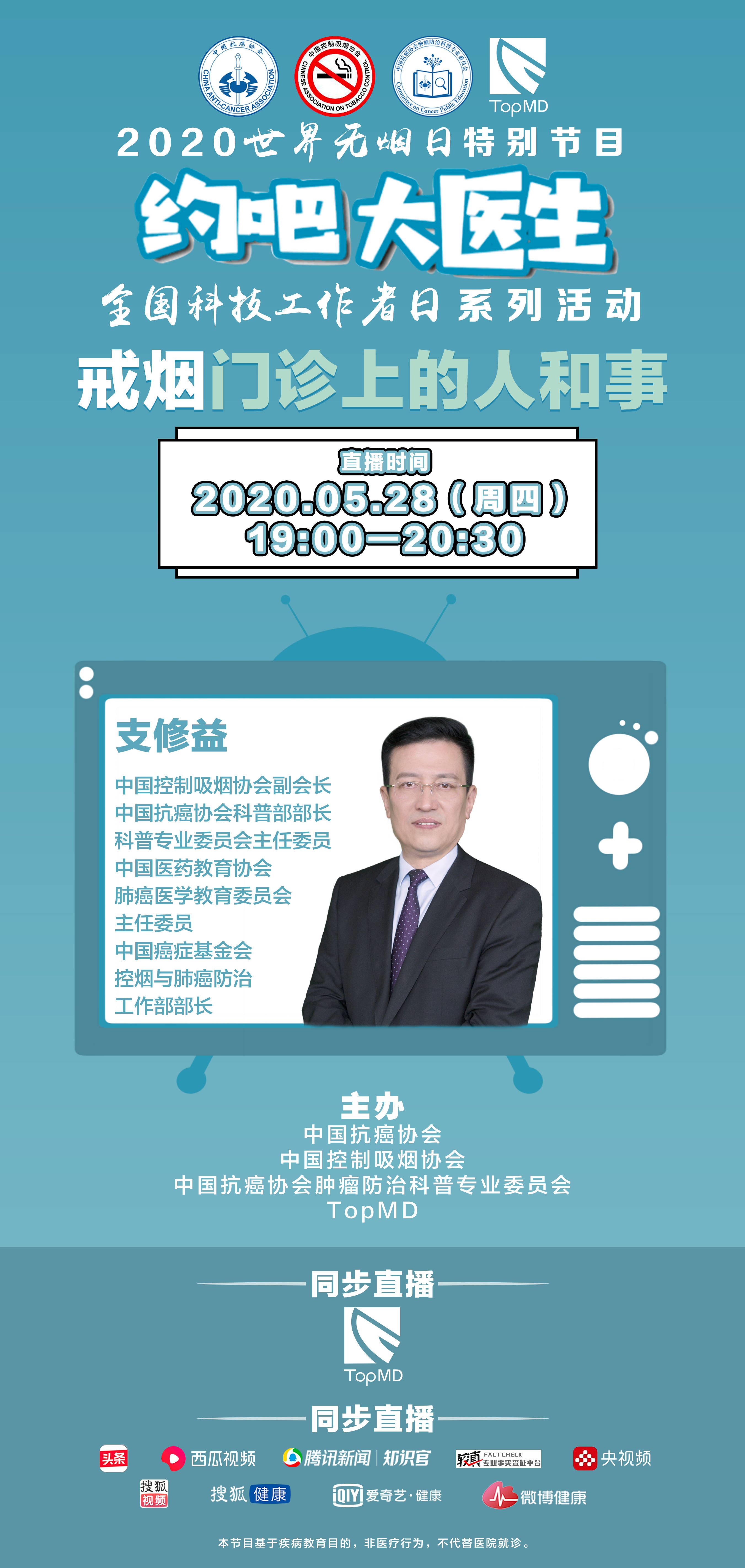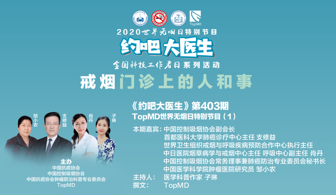 2020年世界无烟日及全国科技工作者日期间,由中国抗癌协会、中国控制吸烟协会、中国抗癌协会肿瘤防治科普专业委员会和TopMD联合举办了世界无烟日系列直播。