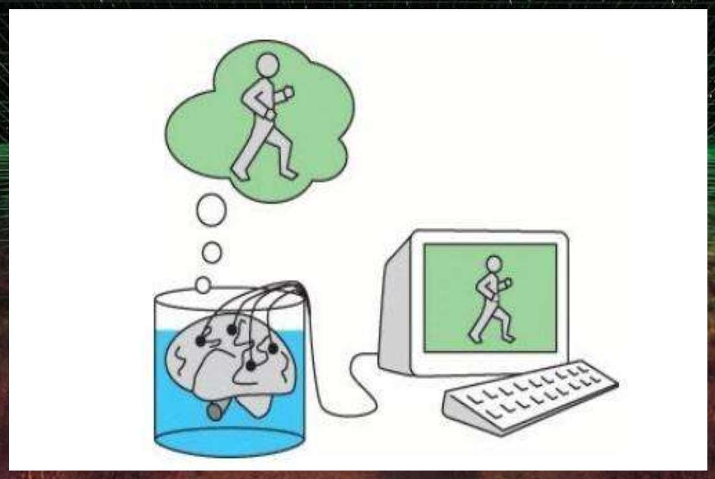 如“缸中之脑”是美国哲学家希拉里·普特南1981年出版的《理性,真理与历史》一书中,描述的一种假设。他认为人所体验到的一切最终都是受大脑转化和支配的,如果把人脑取出来,养在一个配有营养液的缸中保持着它的生理活性,然后通过计算机控制模拟,对这个大脑进行与人类生活中受到刺激相同的刺激,比如个视觉、听觉、触觉、嗅觉等各种刺激,这个大脑就会以为自己还是一个人,生活在现实中而不是虚拟中。