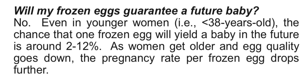 新浪财经发起的投票 | 微博 对于前者,无论是网友,还是果壳接触到的医学专家、社会学专家中,没有人不支持枣枣、于丽颖律师、展滢滢、阿烂和其他许许多多女性对单身女性生育权的争取。就连开庭当天代表医院出庭的医生,都特意当面告诉枣枣,她理解枣枣的行为,也知道社会上的呼声是怎样的。 然而,对于后者,特别是对出于非医疗原因的社会性冻卵,警惕的声音并不比赞同的声音低。我们把另一面的声音呈现出来,希望到了女性掌握选择权的那一天,大家能在了解相对全面的信息后再做出选择。 “非常昂贵的彩票 ” 冻卵常常被形容成女性唯一的“后悔药”,可现实生活没有百试百灵的后悔药。杜小溪医生是被告北京妇产医院、卵巢组织冻存库组建团队核心技术成员,她非常理解枣枣的行为。她认为,单身女性应该拥有使用这项技术的权利,但同时,她也特别强调,女性一定要意识到,冻卵不能保证生育。 卵子是人体中最大的一个细胞,与精子相比体积要大得多,而且富含水分。“细胞里面80%以上都是水,如果直接冻的话,就会产生很多冰晶,就把细胞膜给戳破了”,杜小溪医生解释说。冻卵技术的核心在于把细胞里面的水置换出来,让冷冻保护剂进去、撑住细胞膜。如今被广泛使用的“玻璃化冷冻法”与早期的“程序化冷冻”(又叫慢速冷冻)相比,更简单,更省时省力。杜医生形容整个过程“非常简单粗暴”:取出的卵子用浓度非常高的冷冻保护剂平衡过以后,直接被扔到-190℃以下的液氮里。卵子没有时间反应,几乎是瞬间变成玻璃的样子。这很大程度上可以避免冰晶的形成。 在冻卵过程中使用液氮丨londonwomensclinic 当女性准备怀孕,需要将冷冻保存的卵子复苏并受精,受精卵发育成为胚胎后再移植到子宫内。根据美国生殖医学会和辅助生育技术学会(ASRM–SART)联合发布的冷冻卵子的临床指南,目前玻璃化冷冻的卵子复苏成功率很高,可以达到90%~97%之间,但这只是第一步;之后精卵结合的成功率大约为71%~79%;到了受精卵移植过程,成功率降到17%~41%。 整个冻卵的流程有十多个步骤,每一个步骤都有风险,都不能保证百分之百的成功率。有些中介或媒体宣传冻卵有百分之六七十的成功率,往往只是一个步骤的成功率。综合下来,单个冷冻卵子从复苏到成功怀孕的成功率只有2%~12%。“这是一个非常客观的事实,”杜医生说。 美国生殖医学会在一份冻卵指南中给出的官方数据,并明确指出:冻卵并不保证生育| reproductivefacts.org 因此,冻卵与其说是买保险,不如说是买了一张非常昂贵的彩票。 既然冻卵不能保证生育,把使用冻卵技术和实现单身女性生育权画上等号,或许就存在问题了。北京协和医院医学伦理学讲师张迪告诉果壳,要区分开两种权利。一种是女性获得技术的权利。即使冷冻的卵子复苏率很低,哪怕只有0.1%,女性也有获得这项技术的权利。但是,通过冻卵技术能不能实现女性的生育权,是另外的问题。类似的,我们每个人都有买药的权利,但是如果药物不通过临床试验就上市,个人的健康权没有办法得到保证。因此,国家药监部门需要通过制度来保证药物的疗效,这样才能保证公民的健康权。 对于冻卵这项技术,需要通过临床试验、通过国家药监部门设置的技术门槛后,方能应用。多位医生告诉果壳,涉及冻卵的临床试验已经在进行中,属于某个国家重大科技专项的一部分。只是,恐怕大家还需要等待一段时间。 医疗救济手段还是医疗福利措施 冻卵技术最早是为罹患癌症的女性保存生育能力而应用的。现如今频频被媒体报道的冻卵案例大多属于非医疗原因冻卵,又叫社会性冻卵。 虽然美国、英国等国家向所有女性开放了冻卵技术,但在欧洲其他国家,比如法国,和国内一样,并不允许健康女性出于社会性原因冻卵。也和国内一样,法国的部分单身女性也会选择出国冻卵。即便是在开放了冻卵技术的美国、英国等地,国家生殖医学协会也不鼓励社会性冻卵,不鼓励女性将冻卵当成一种生活方式。 因为冻卵使得女性不得不面对额外的风险。女性通常一个月只会排一个卵子。而为了保证未来生育的成功率,医生一般建议冻20个以上的卵子,这需要借助促排卵药物。 据杜医生介绍,在药物的刺激下,一个周期长出十几个卵泡算是一个比较好的水平,很多女性达不到这个数量,就需要两个以上的周期才能取到足够多的卵子。每颗成熟的卵泡会分泌200 ~300 pg/ml的雌激素,十几颗的话就会达到上千的雌激素。过高的雌激素有可能对身体造成过度刺激,引发卵巢过度刺激综合征(OHSS),导致腹水、胸水、腹痛、心肺功能异常,严重的可能导致终身不育,甚至死亡。 与此同时,如果因为有冷冻的卵子这条“后路”使得女性对未来产生错误的安全感,从而推迟生育计划,这将导致35岁以上的高龄孕妇增多。相较于处于最佳生理育龄期的女性,高龄孕妇要承担更大的风险,还要面对妊娠高血压、妊娠糖尿病等并发症。 然而,在中介和商家的广告中,非但没告知女性冻卵可能面临的风险,还将冻卵塑造成和整形手术类似的生活方式,给消费者一种虚幻的期待——整容了、变美了、冻卵了,就能从此掌控自己的人生。 图丨Bianca Bagnarelli for NBC News 针对国内的现状,不鼓励社会性冻卵的原因还有一条——社会性冻卵会挤占稀缺的医疗资源。杜医生拿自己所在的国内唯一一家卵巢组织冻存库举例。和冻