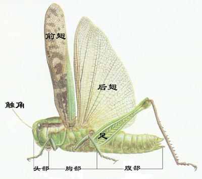 (2)头部是感觉和取食中心,具有口器(嘴)和1对触角,通常还有复眼及单眼;