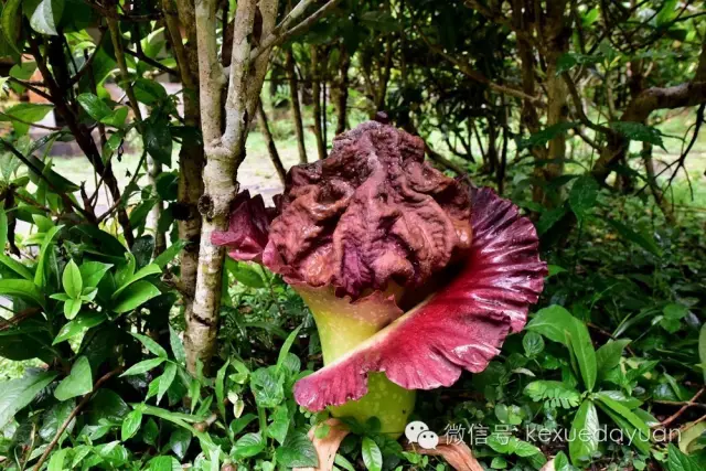 疣柄魔芋,天南星植物,先开花后发叶,花朵巨大无比。夜间花朵会突然升温,释放恶臭,吸引屎壳郎传粉。