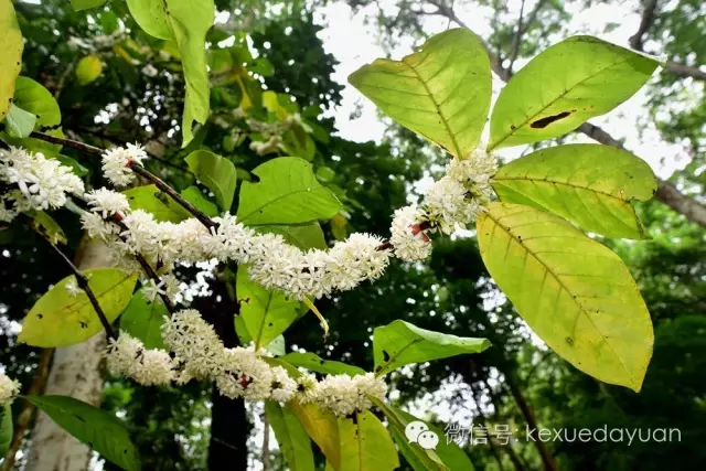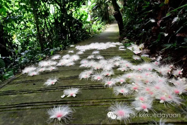 梭果玉蕊,西双版纳热带雨林中著名的植物之一,它的果实形如梭子,故名。梭果玉蕊的花成一串一串的,在凉爽的夜间开放,吸引夜行动物传粉。每当清晨,梭果玉蕊花朵便从树上凋零,落在林间小路之上。远远看去,如一群蜘蛛精,满铺在地。网友水潋文见图写诗一首:幕色沉醉径自开(编者注:此处“幕色”疑为“暮色”),幽静花好无人来。园景深意等君爱,娟落玉蕊不嫌晚。