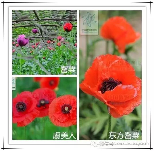 在日常生活中,有些植物与罂粟长得非常相似,罂粟(Papaver somniferum L.)、虞美人(Papaver rhoeas L.)和东方罂粟(鬼罂粟)(Papaver orientale L.),它们同属于罂粟科罂粟属的不同种植物,三者乍看外形很像,特别是花朵有相似之处,但仔细观察我们就可发现它们的不同点: