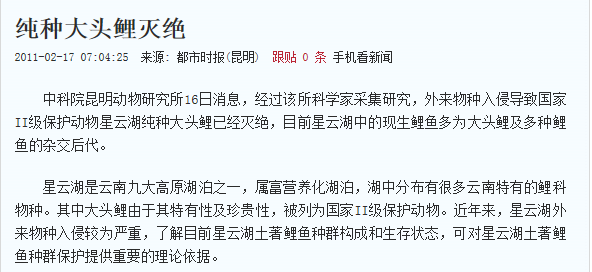 关于纯种大头鲤灭绝的新闻报道截图