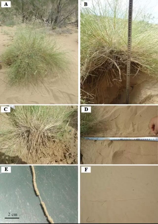 注:A:羽毛针禾植株原生状态;B:挖设土壤剖面(40cm)采集根鞘土壤;C:羽毛针禾完整原状根系;D:具根鞘根系长度原位测定(长达90cm);E:根鞘近照(白色根外包裹着根鞘,根直径约0.9 mm,根鞘直径3.8 mm–4.2 mm);F:根系裸露于沙面,此时根鞘大部分脱落。