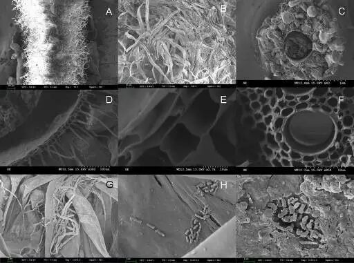 注:A:外部形态扫描;B:菌丝体及根毛相互缠绕;C:根鞘横切;D:中空腔室;E:加厚的外皮层;F:发达的导水细胞;G:真菌菌丝体的捆绑作用;H:细菌的群感效应;I:分泌物的粘结作用