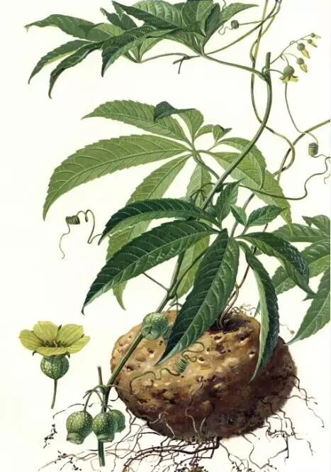 多年生攀援草本;根具膨大块茎,块茎扁卵圆形,中央稍下凹,常半裸于土面。茎和小枝细弱;卷须线形,先端2歧;趾状复叶通常具7枚小叶,纸质。花雌雄异株;雄花花冠浅黄绿色,雄蕊5;雌花子房近圆形,花柱3。果近球形,密布疣状瘤突。种子暗褐色,宽卵球形,密生细瘤突。花期6-10月,果期7-11月。分布于云南中部和西部地区,生于1800-2400米杂木林下或灌丛中。块根用作提取雪胆素原料或生药入药。内容来源:《中国植物志》。