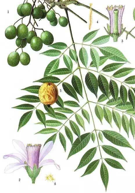 乔木;二回羽状复叶,每1羽片有小叶4-5对,小叶对生,椭圆状披针形。圆锥花序聚生于小枝顶部的叶腋内;花瓣淡紫色,雄蕊管圆柱状、紫色。核果椭圆状球形,果皮薄,熟后淡黄色;核稍坚硬。花期3-4月,果期10-11月。分布于甘肃、湖北、四川、贵州和云南等省,其他省区广泛栽培,生于土壤湿润,肥沃的杂木林和疏林内。采其熟后的果实晒干,叫川楝子、金铃子,有小毒,入药有泻火、止痛、杀虫作用。内容来源:《中国植物志》。