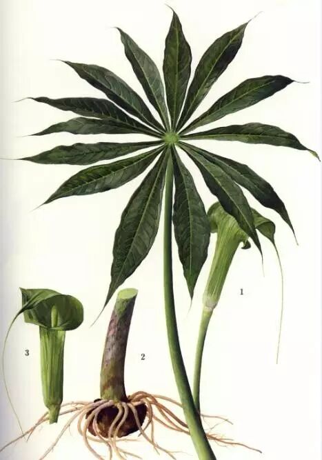 多年生草本;块茎扁球形,直径可达6厘米,表皮黄色,有时淡红紫色。叶1片,叶柄长40-80厘米,中部以下具鞘;叶片放射状分裂。花序柄比叶柄短,直立;佛焰苞绿色,管部圆筒形;肉穗花序单性。浆果红色,种子1-2,球形,淡褐色。花期5-7月,果9月成熟。我国多个省区都有分布,海拔3200米以下的林下、灌丛、草坡、荒地均有生长。块茎入药,与天南星通用,为历史悠久的中药之一,能解毒消肿、祛风定惊、化痰散结。内容来源:《中国植物志》。