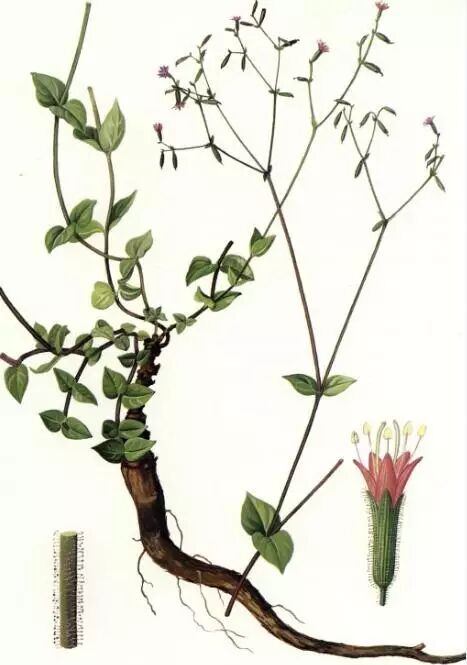 多年生草本;根圆锥形,棕黄色,肉质;茎铺散,平卧,常带紫绿色,被柔毛;叶片卵形。花萼筒状钟形,密被腺毛,绿色;花瓣紫红色;雄蕊明显外露,花药黄色。花期6-9月,果期7-10月。分布于四川、云南、贵州、西藏,生于金沙江和雅鲁藏布江沿岸,海拔2 000-3 800米的砾石山坡或石灰质岩石缝中。根入药,治跌打损伤、胃疼。内容来源:《中国植物志》。