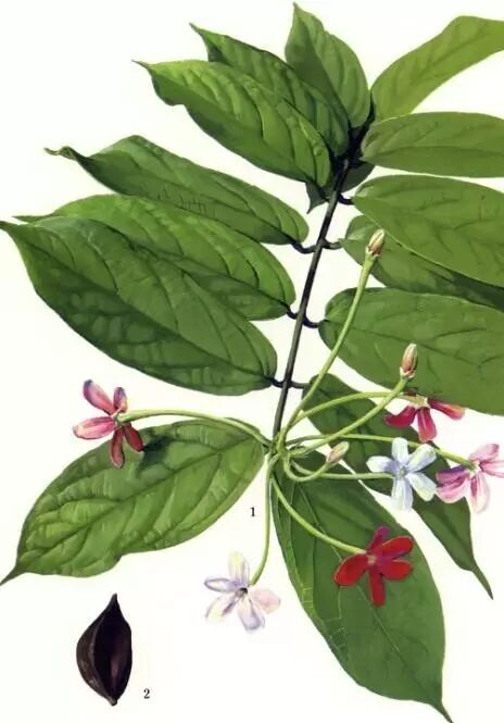 攀援状灌木;小枝被棕黄色短柔毛。叶对生或近对生,叶片膜质,卵形或椭圆形。顶生穗状花序,组成伞房状;花瓣5,初为白色,后转淡红色。果卵形,短尖,长2.7-4厘米,具明显的锐棱角5条,成熟时外果皮脆薄,呈青黑色或栗色;种子1颗,白色。花期初夏,果期秋末。分布于四川、贵州至南岭以南各处。种子为中药中最有效的驱蛔药之一,对小儿寄生蛔虫症疗效尤著。内容来源:《中国植物志》。