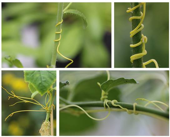 例如,我国的南方菟丝子(Cuscuta australis)寄生在大豆和野生番茄上长得就异常茂盛,在生长旺盛期,每天能增长达5、6 cm。