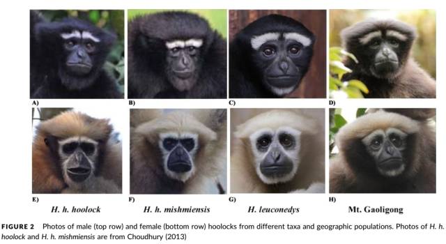 从左到右依次是 西白眉长臂猿,西白眉长臂猿米山亚种,东白眉长臂猿,天行长臂猿。照片来自: Fan et al. 2017 Description of a new species of Hoolock gibbon (Primates: Hylobatidae) based on integrative taxonomy