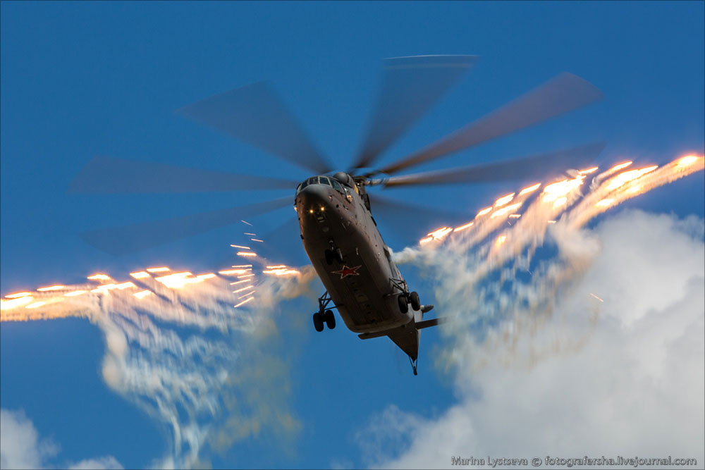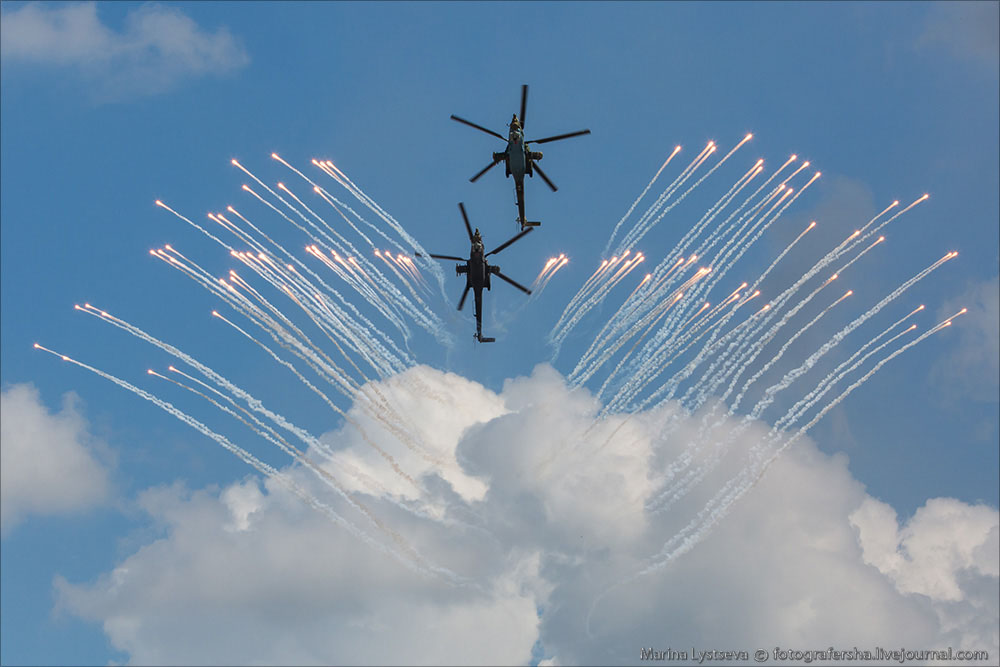 ▲ 俄罗斯“金雕”直升机飞行表演队的米-28武装直升机编队抛洒干扰弹。