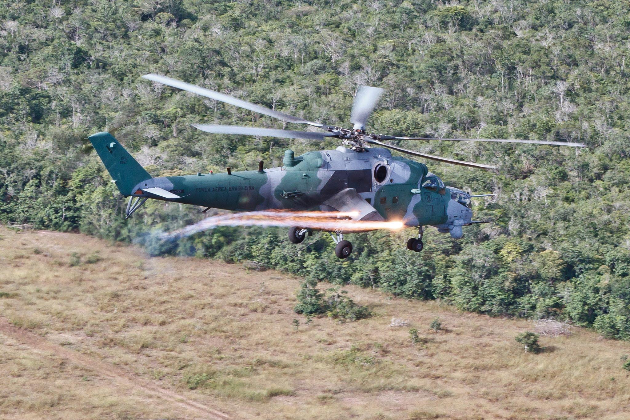 ▲ 巴西AH-2武装直升机(米-35M的出口型)释放干扰弹。