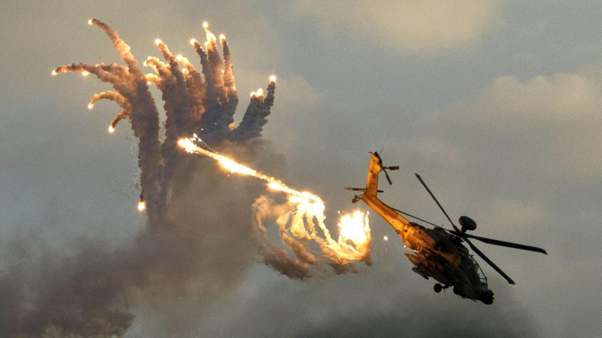 ▲ 以色列的AH-64D武装直升机抛洒干扰弹。