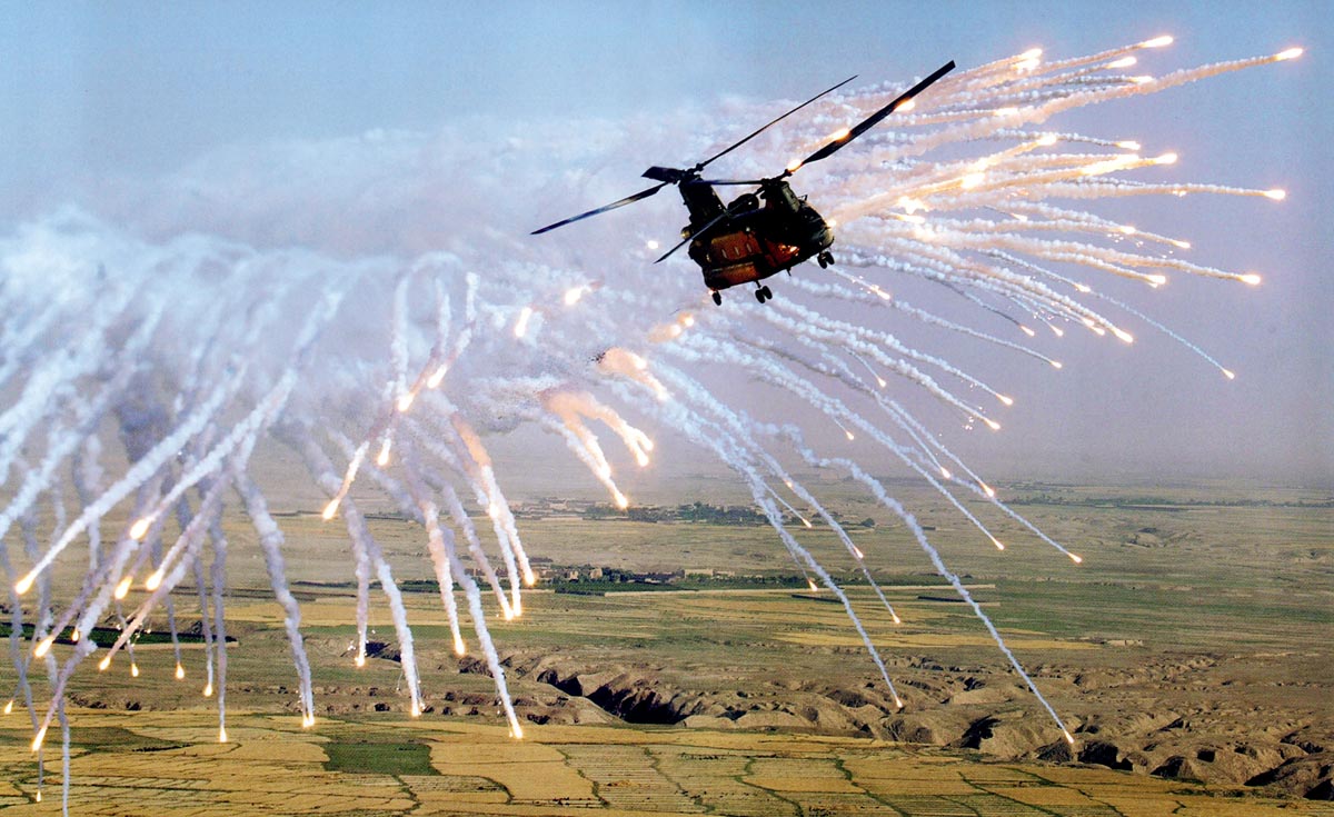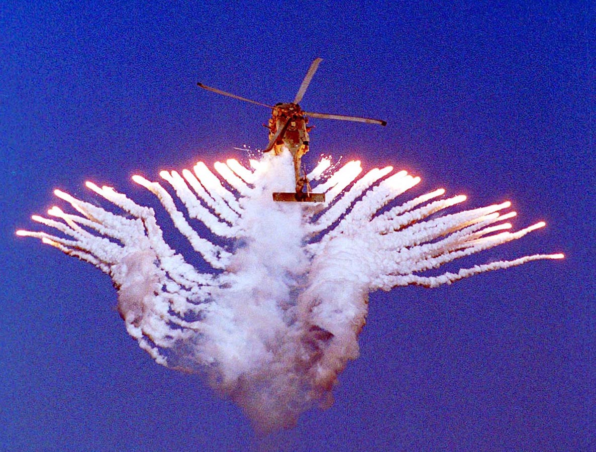 直升机虽然是一树之高的“树梢杀手”,但武功再高也怕菜刀。对于武装直升机而言,菜刀就是各种轻武器和小口径高射炮,以及红外制导的便携式防空导弹了。因此,红外干扰弹就成了各种直升机的标配。除了关键时刻能“保命”,在释放的时候也是非常壮观的。