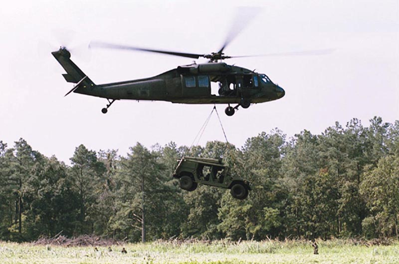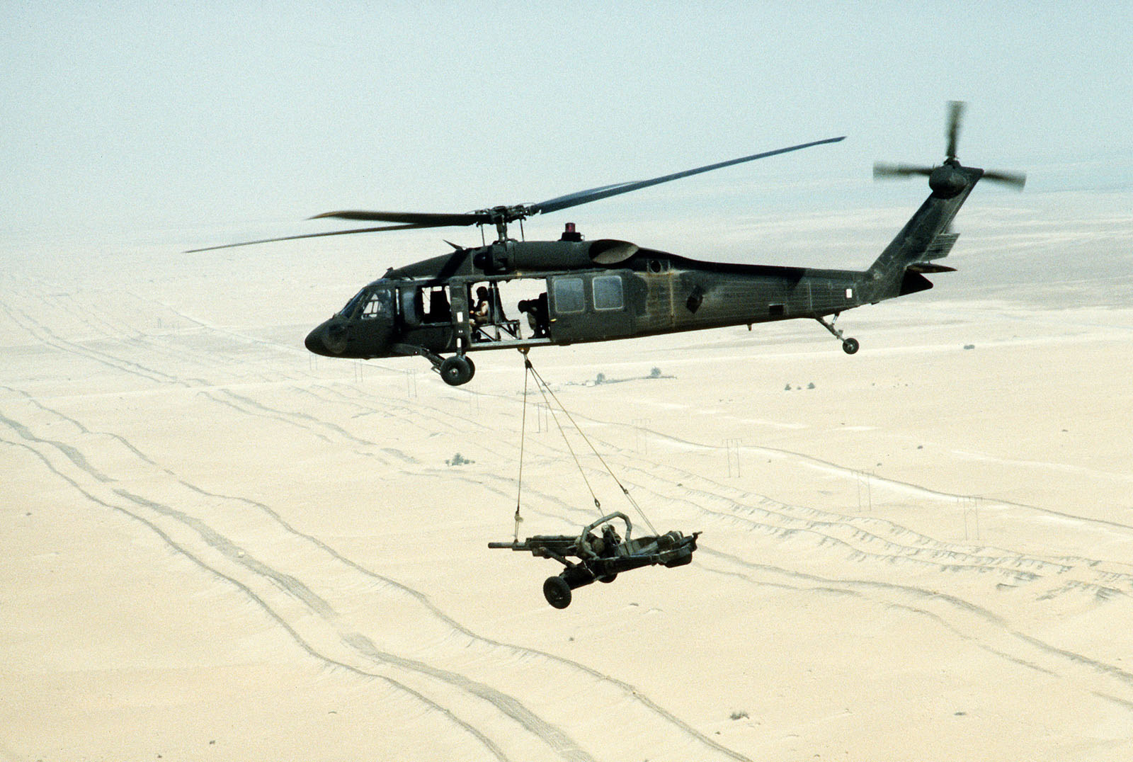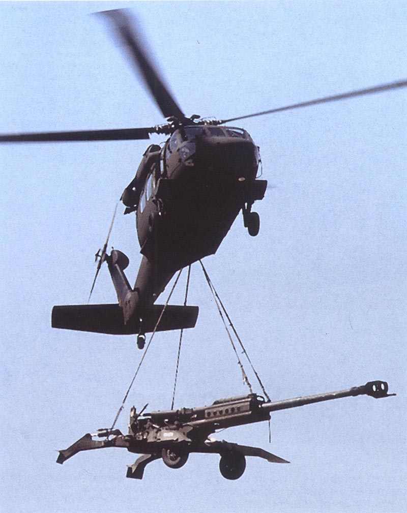 ▲ 美陆军第82师第2营的UH-60直升机吊运M102榴弹炮。