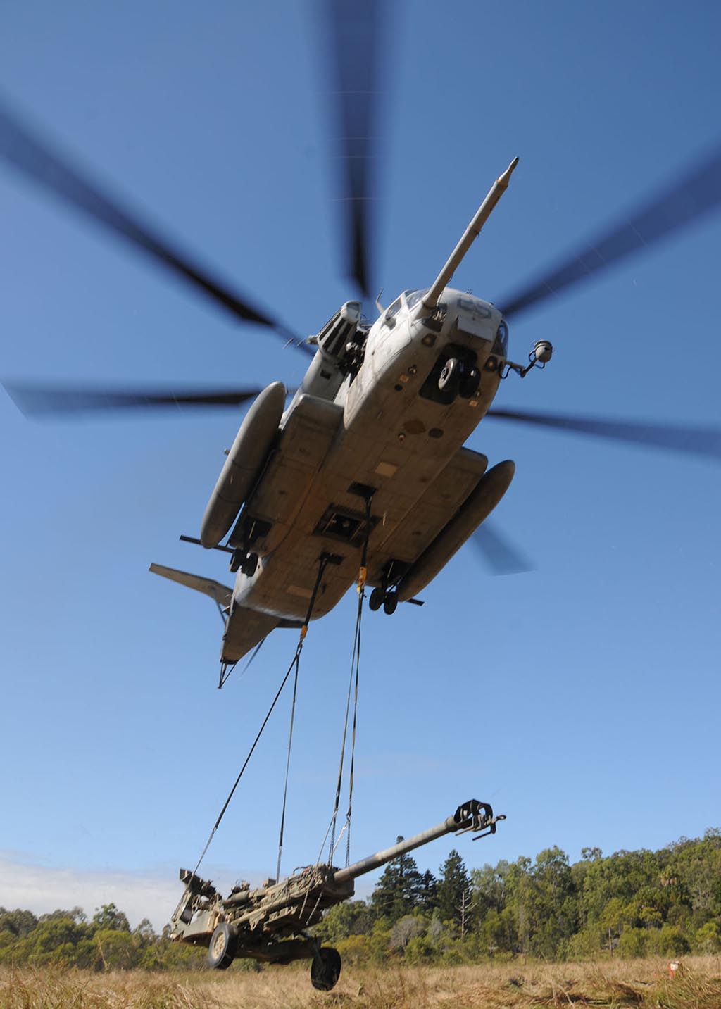 ▲ MV-22倾转旋翼机吊运M777榴弹炮。