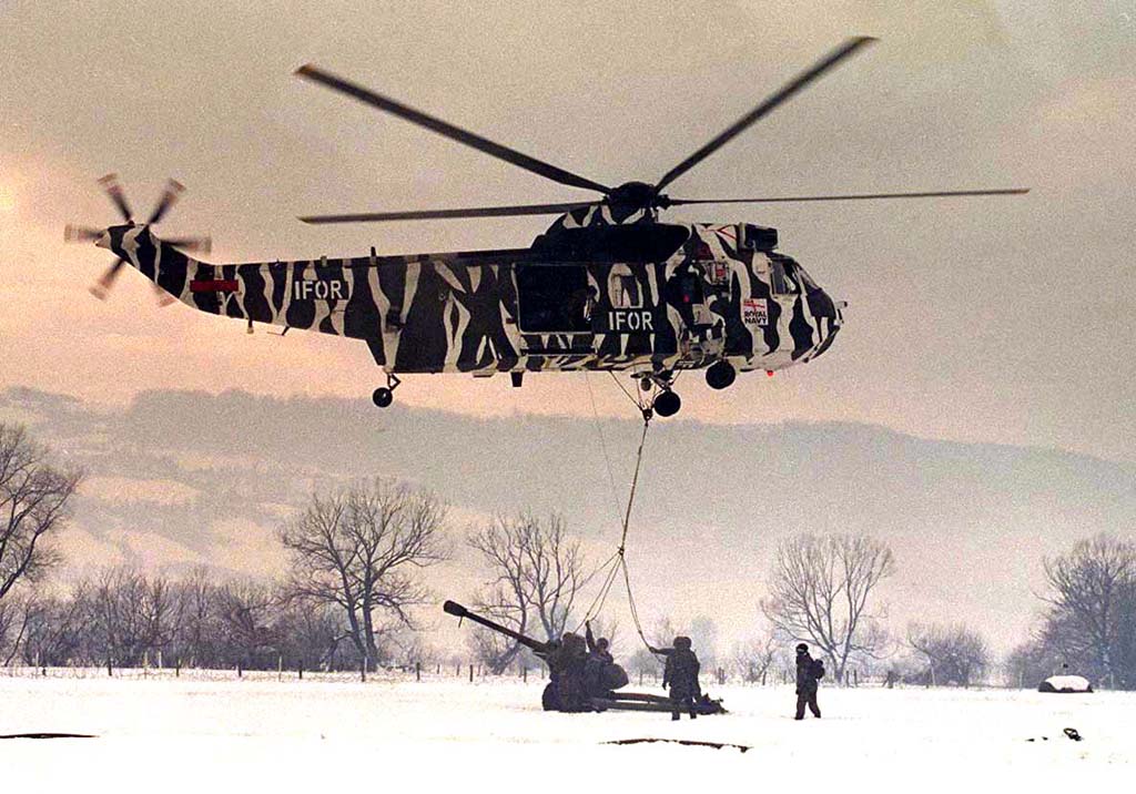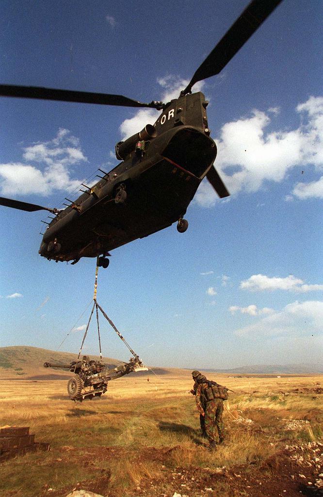 ▲ 英军“支努干”直升机吊运L119榴弹炮。