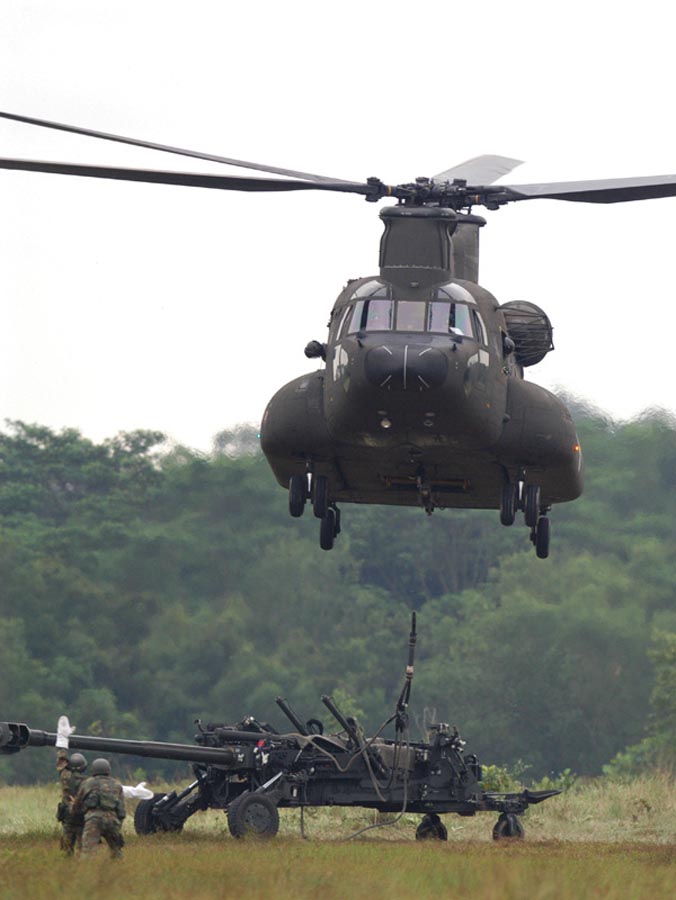 ▲ 新加坡CH-47直升机吊运“柏伽索斯”轻型榴弹炮。