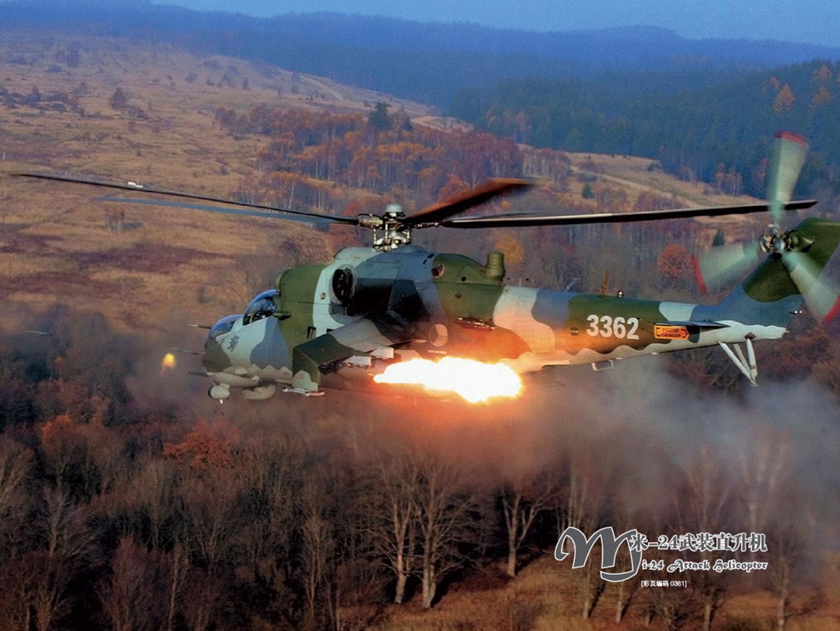 ▲ 俄罗斯的米-24武装直升机发射火箭弹。